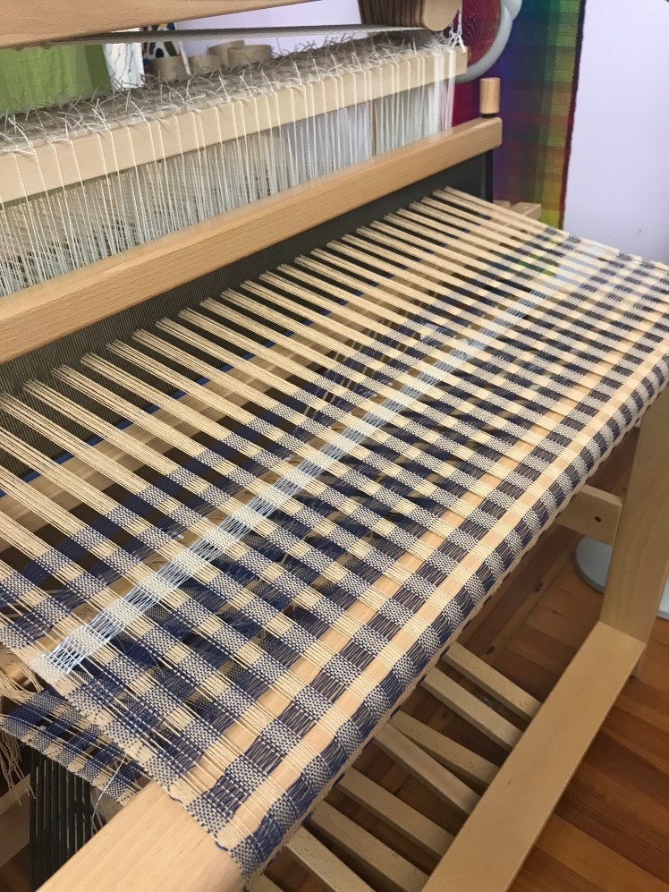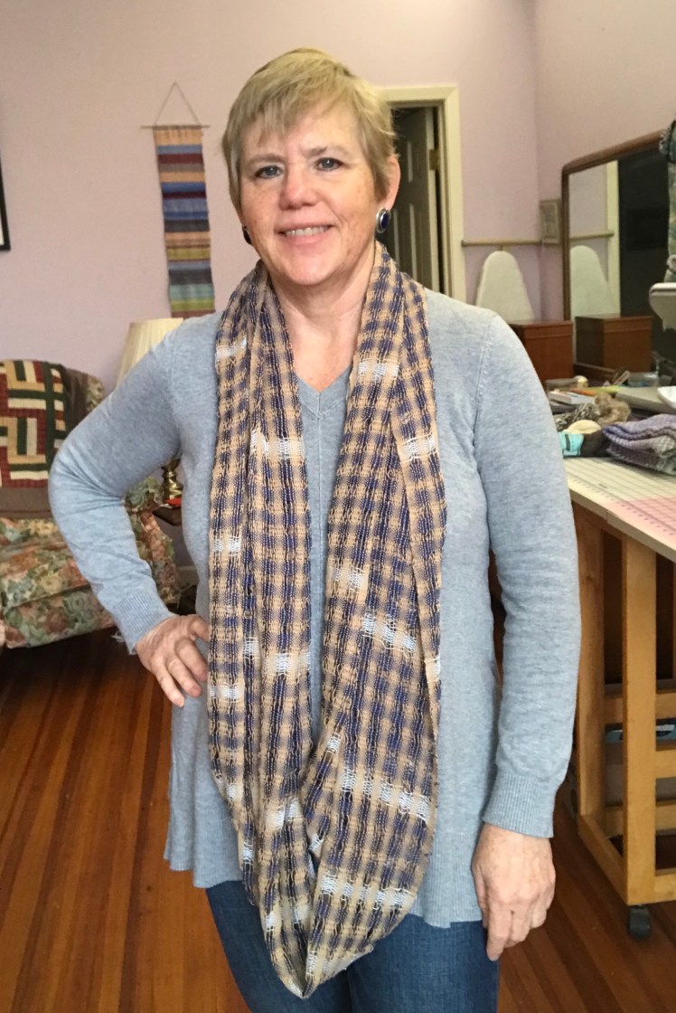 A cotton and silk scarf with three different spacings, a technique called cramming and denting. The silk makes this one extra-yummy, as you can see by the delighted expression of the garden bunny. May we all be as satisfied as the garden bunny!
