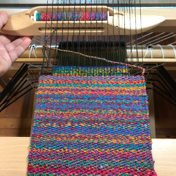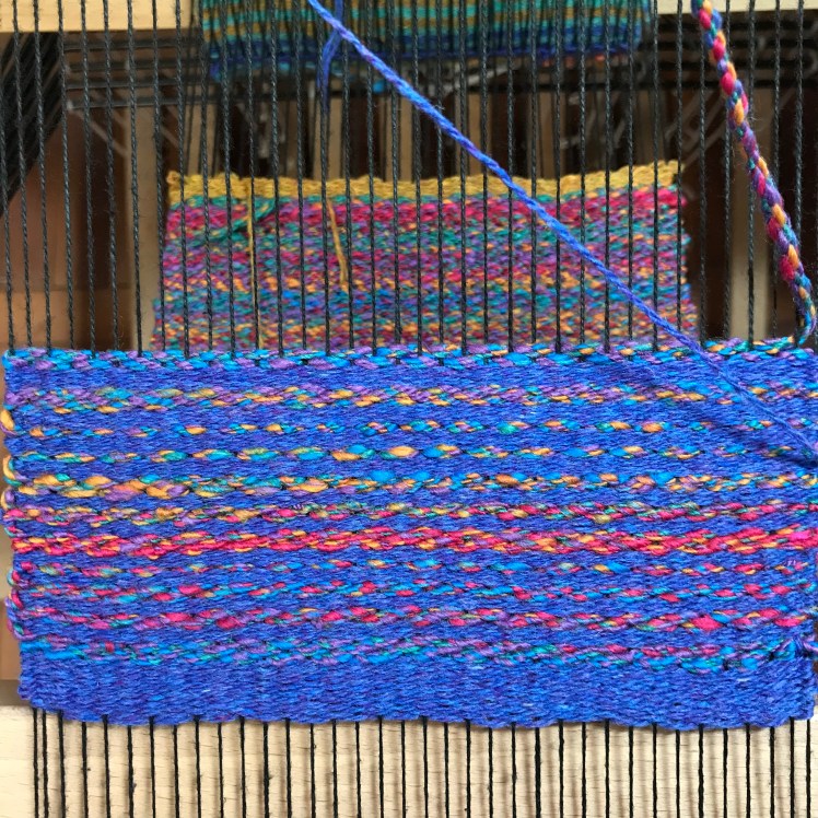 I’m happy with the result and I sold the majority of them and donated the remainder for a silent auction. It was fun to do seventeen little experiments in color, but the weaving is extremely slow.
