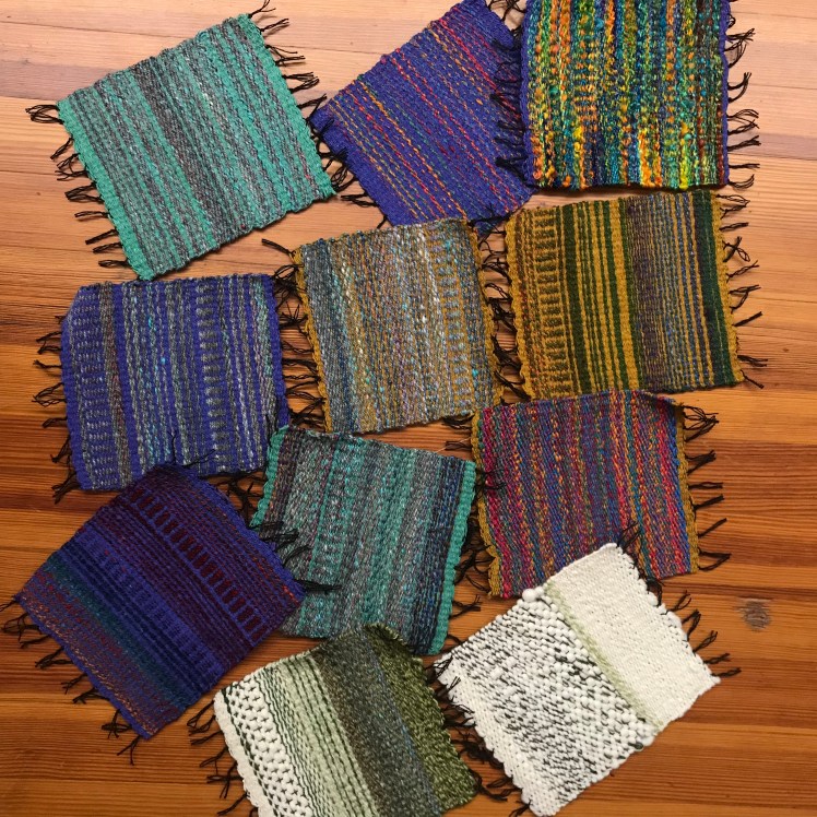 On my adventure with Jane Stafford’s Online Guild, I did some weft-faced weaving. This is weaving where the warp yarns are spread out enough that the weft (the yarn on the shuttle that goes back and forth) completely covers the warp and the only thing you see is the fringe. I wove seventeen mug rugs/coasters.