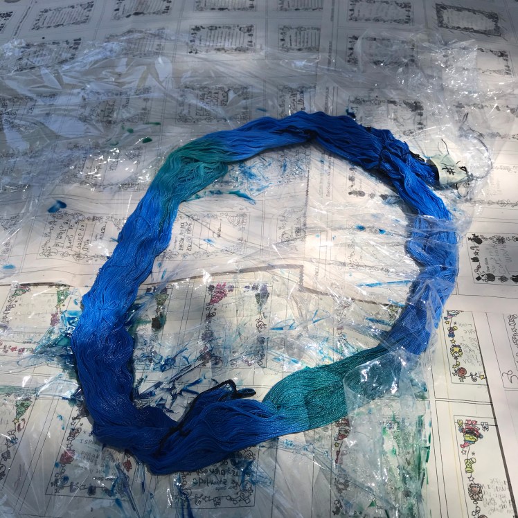 Below, the yarn stayed wrapped up overnight, and was washed and put out to dry the next day.