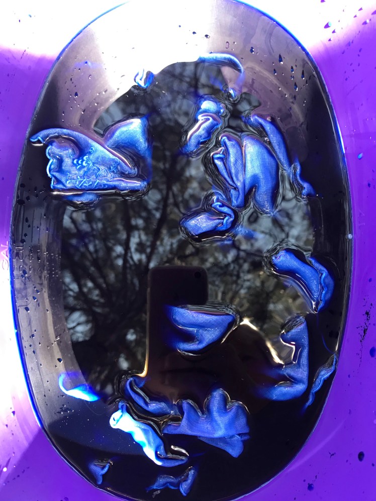 Above, forty wine coasters I found in my late mother-in-law’s linens, soaking in a bucket of blue.