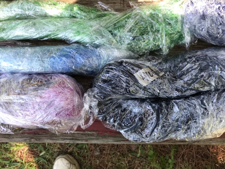 I am not a dyer, but I do enjoy a dye class now and then. Still, during the dog days of sheltering in place, there I was. I cleaned out my weaving closet and there was that back corner of dye supplies and a bunch of already prepped yarn. The weather has been mostly perfect lately, so I dove in.