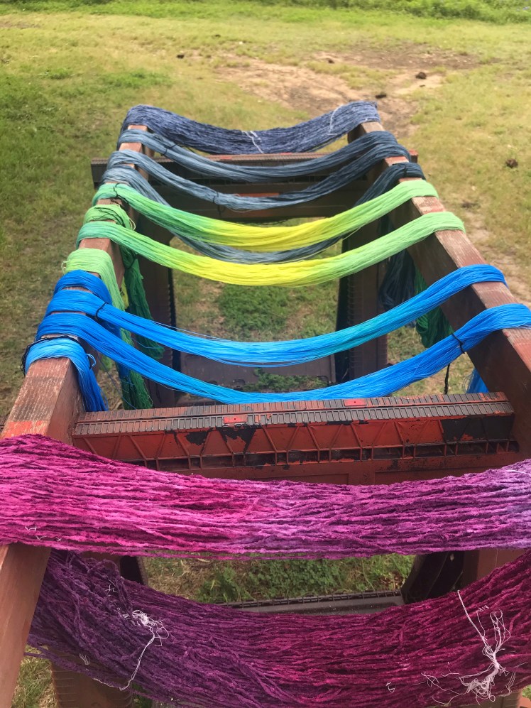 I space-dyed the warps and chenille by laying them out flat and pouring the dye over them.