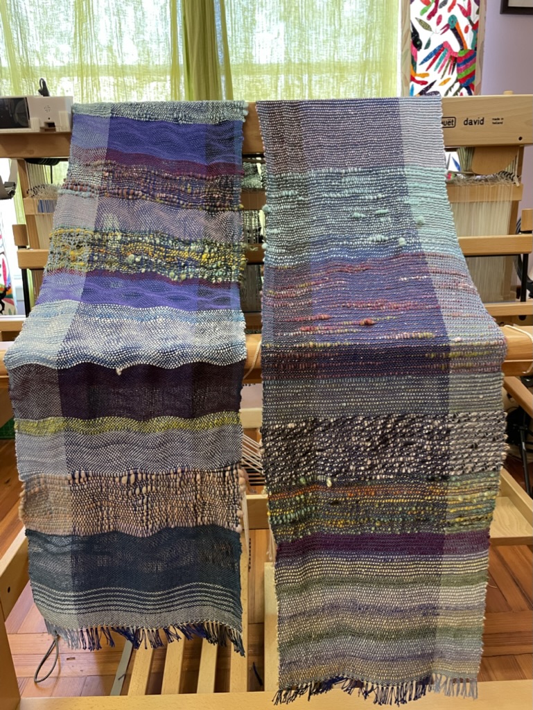 I bought a wave shuttle a year or so ago and finally busted it out and had a great time playing with it. The wavy scarf (left) took a while to weave, but I am so excited about using some of the fun, textured yarn that I learned how to spin from Emily Wohlscheid of Bricolage Studios over Zoom. See how the beehives kind of pop out in the blue section of the scarf on the right? Fun.
