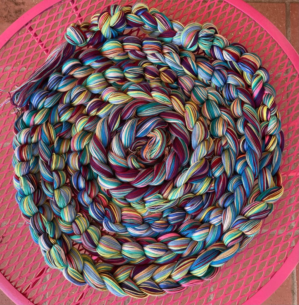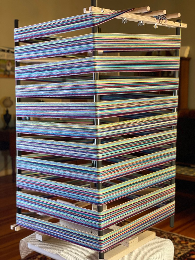 Finally, I wound the longest-ever (for me) warp for some towels, going on the loom this afternoon. It was a slow process on the warping mill because everything was so close together, but I still did it in an afternoon. I can’t wait to get started on these towels!